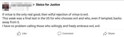 It’s important that we also note a difference here between the Cynic school, our mother school, and the Stoic. Cynicism was descended from the Cyrenaics, where pleasure is held to be a good. It might seem strange at first that a school which held up ἡδονή (pleasure) as a good would chose to live as the Cynics did. Yet we see a parallel in the Epicureans, who espoused a more meager sort of pleasure, a simple kind. At this point our schools diverge, on the underlying moral values. The reasoning, though, is similar as it’s presented here. How we handle material, external, indifferent things has a moral component and matters in the practice and progress of our own virtue.